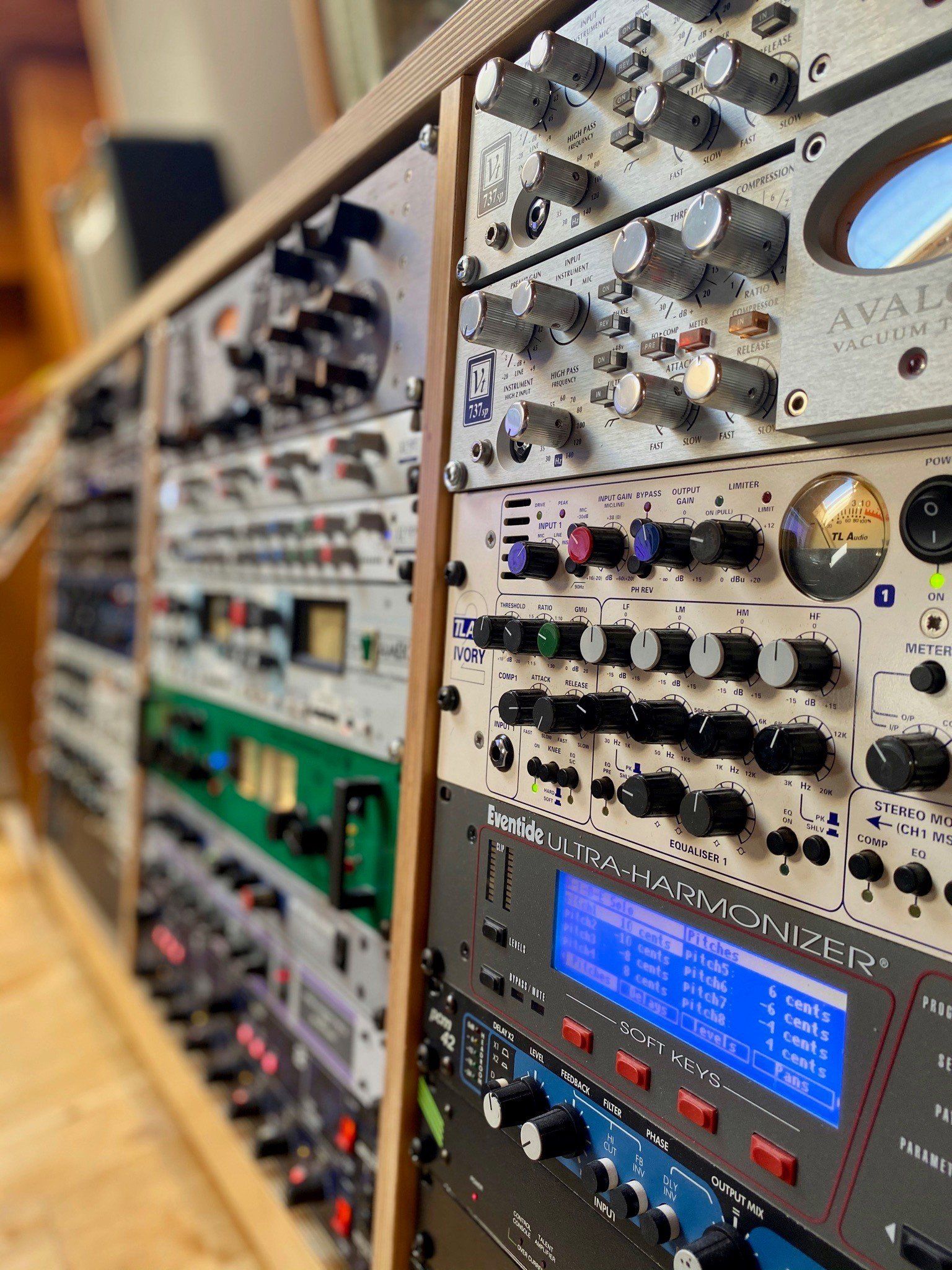 The Siderack houses many analog treasures such as the Manley VoxBox, the Stereo Variable MU compressors or their Stereo Tube EQ. Equalizer from TubeTech, various compressors from Summit Audio or the Amek 9098, designed by Rupert Neve.